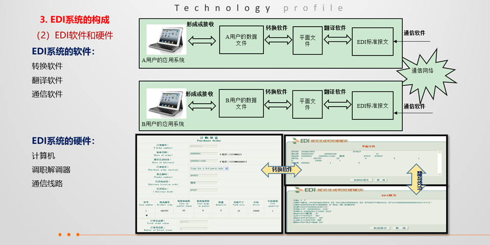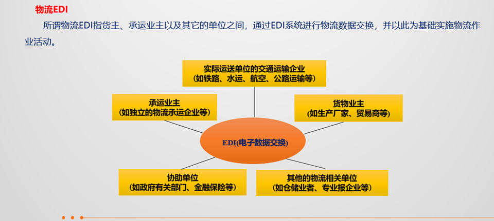 国际标准化组织(ISO:International Standards Organization)于1994年确认了EDI的技术定义:“根据商定的交易或电文数据的结构标准实施商业或行政交易从计算机到计算机的电子传输。”
