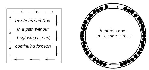 The answer to this paradox is found in the concept of a circuit: a never-ending looped pathway for electrons. If we take a wire, or many wires joined end-to-end, and loop it around so that it forms a continuous pathway, we have the means to support a uniform flow of electrons without having to resort to infinite Sources and Destinations: