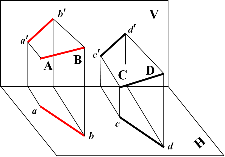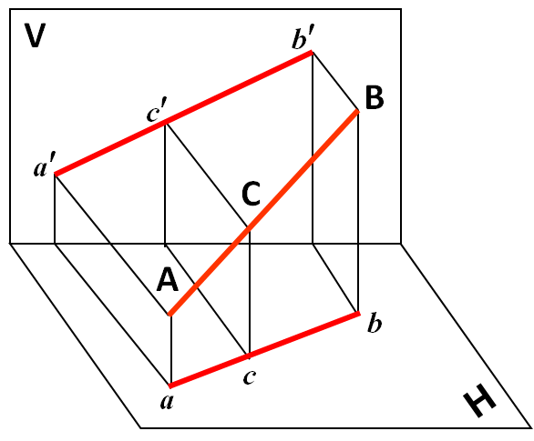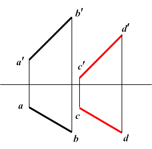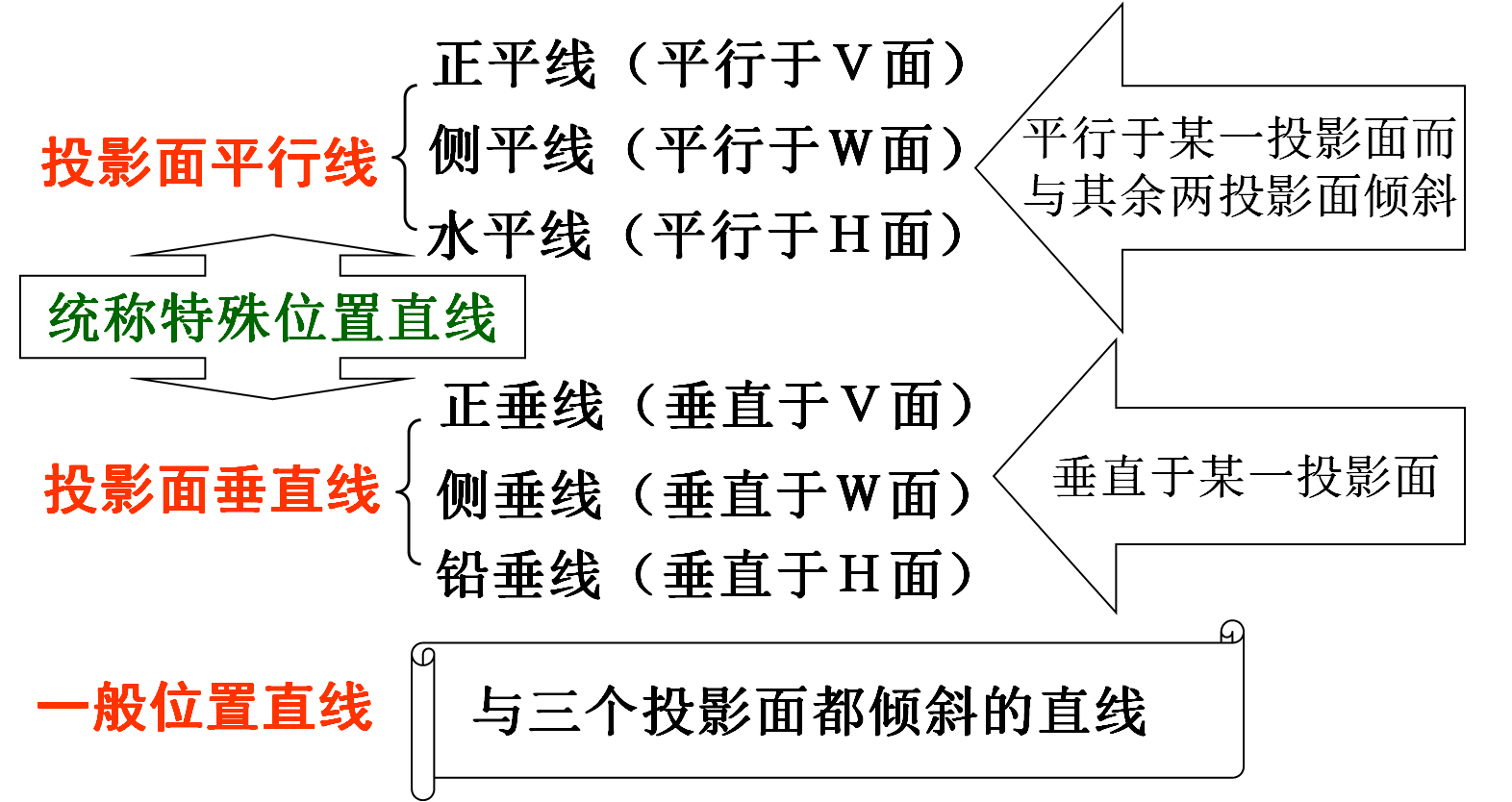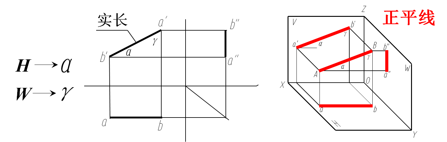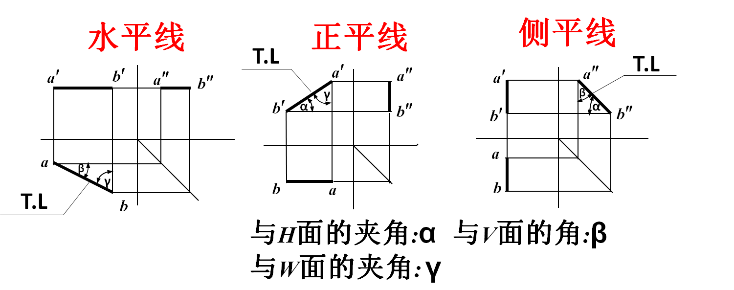投影特性:① 在其平行的那个投影面上的投影反映实长,并反映直线与另两投影面的倾角。