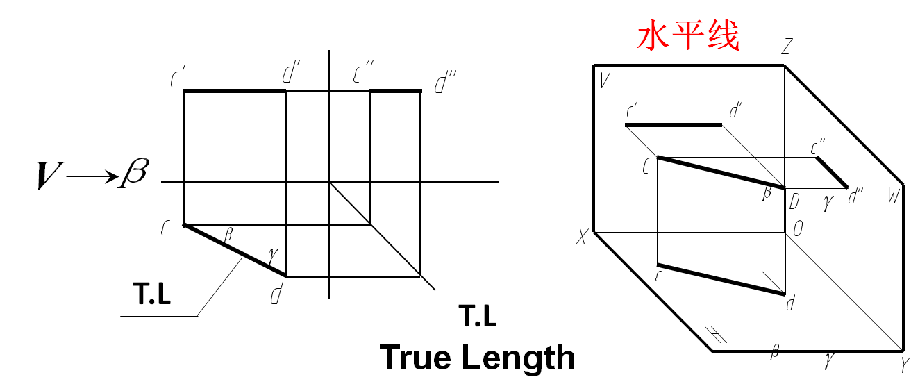 投影特性:① 水平投影反映实长,与X轴的夹角反映β角、与Y轴的夹角反映γ角。