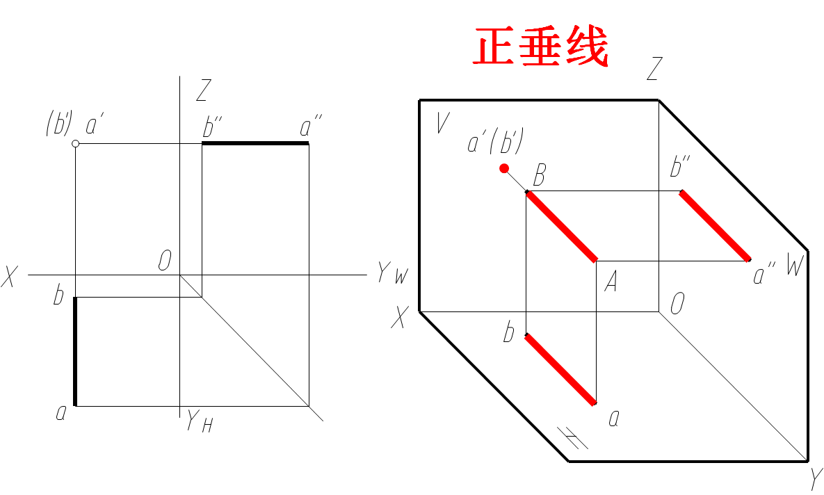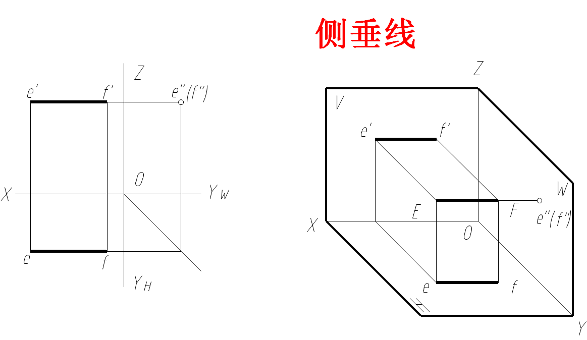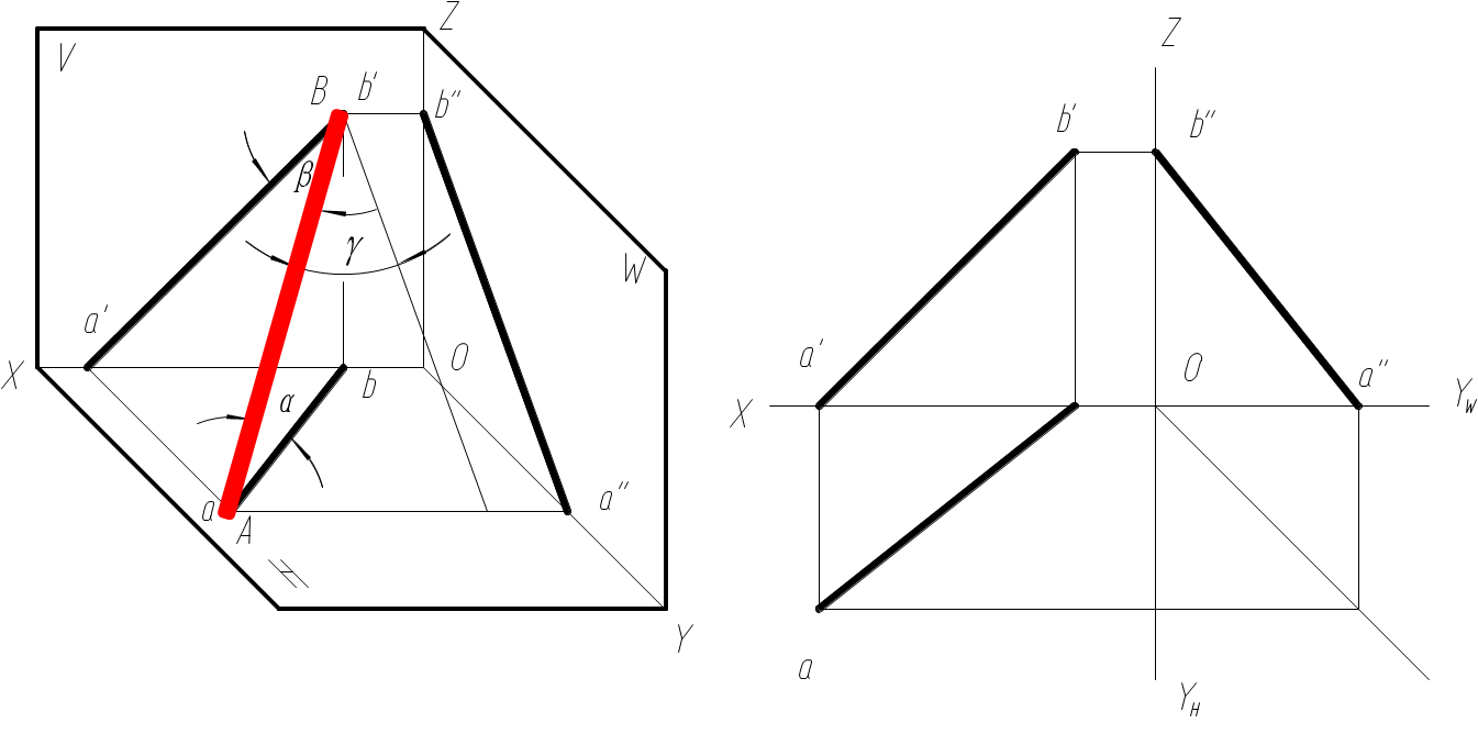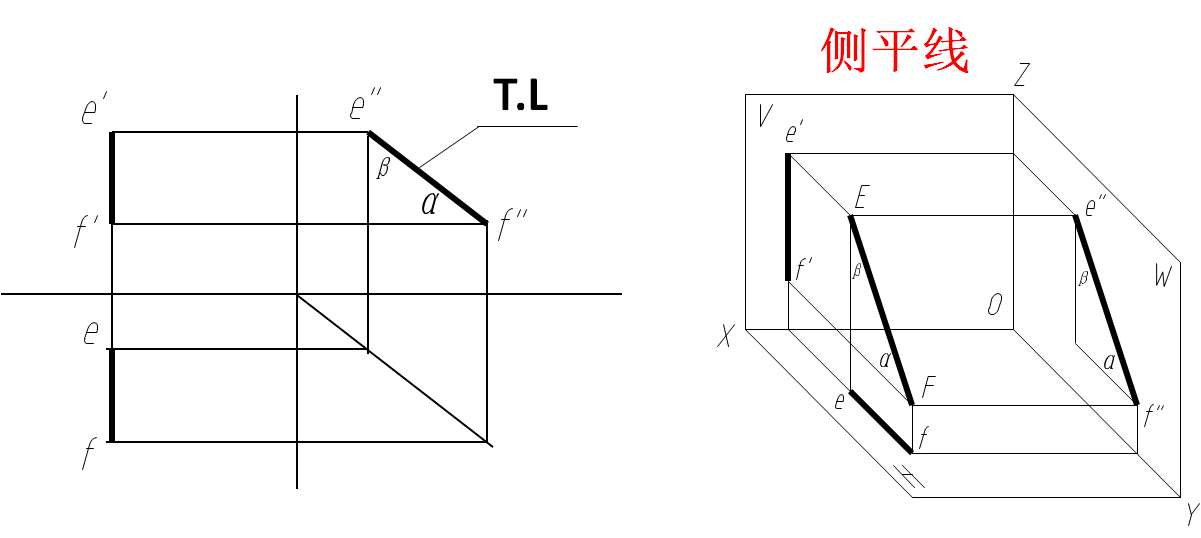 投影特性:① 侧面的投影反映实长,与Y轴的夹角反映α角、与Z轴的夹角反映β角。