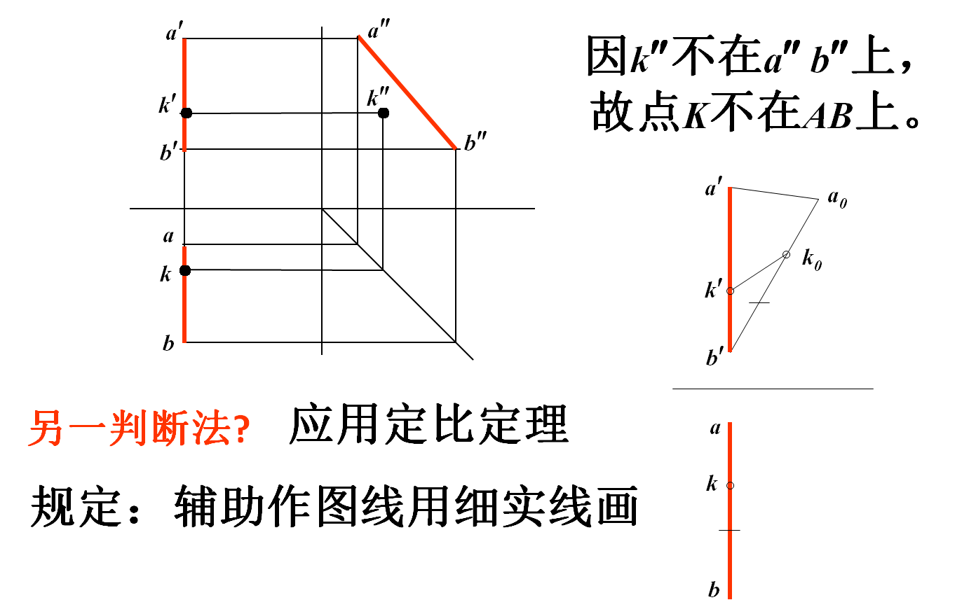 若点的投影有一个不在直线的同名投影上, 则该点必不在此直线上。