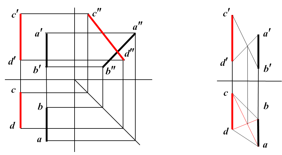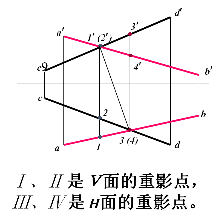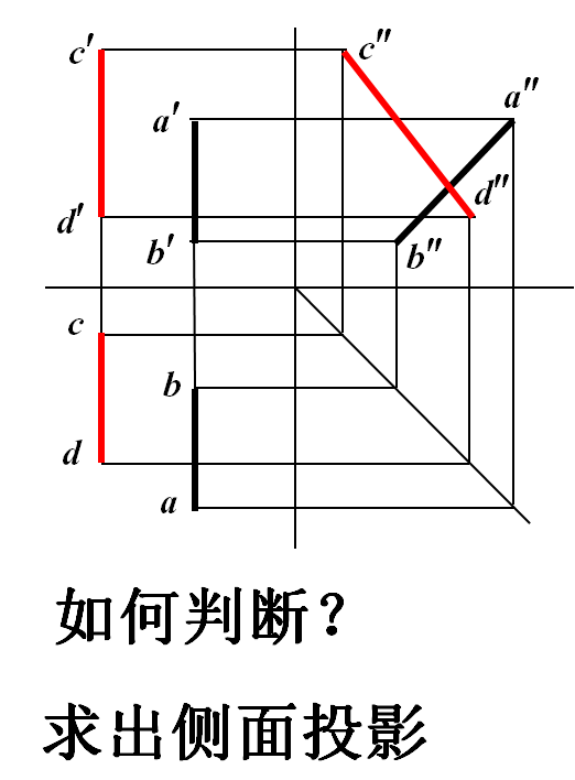 判别方法:若空间两直线相交,则其同名投影必相交,且交点的投影必符合空间一点的投影规律。