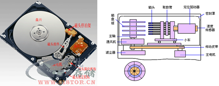 硬盘也被称为磁盘,这是因为在硬盘中是利用磁介质来存储信息的。一般而言,在密封的硬盘内腔中有若干个磁盘片,磁盘片的每一面都被以转轴为轴心、以一定的磁密度为间隔划分成多个磁道,每个磁道又进而被划分为若干个扇区。磁盘片的每个磁盘面都相应有一个数据读出头。简单地说,当数据读出头“扫描”过磁盘面的各个区域时,各个区域中记录的不同磁信号就被转换成电信号,电信号的变化进而被表达为“0”和“1”,成为所有信息的原始“译码”。
