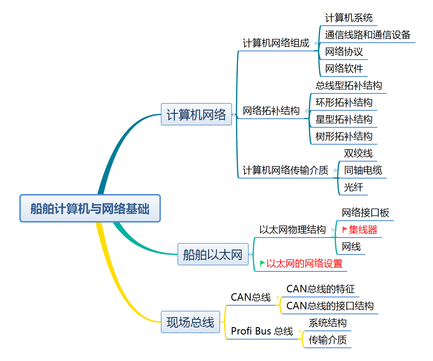 (1)知识点精讲:① 船舶计算机网络的组成;② 船舶以太网的网络设置;③ CAN总线的电气特性
