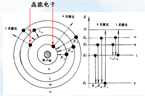 产生特征X射线的根本原因是原子的内层电子被激发引起的电子跃迁。用高速运动的电子、质子、中子以及g射线、高能X射线均可使原子的内层电子激发。在X射线管产生的特征X射线是由于阳极原子的内层电子被飞驰而来的电子激发引起电子跃迁所产生的。