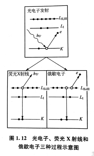 伴随光电吸收会产生荧光X射线和俄歇电子。因为光电吸收后,原子处于激发态,内层出现空位。这时,外层电子就要往内层的空位跳,多余的能量会以特征X射线的形式释放出来。这种由X射线激发出来的X射线,称为荧光X射线。¾由X射线激发出来的二次X射线。