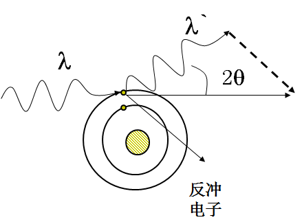 当X射线光子与束缚力不大的外层电子或价电子或金属晶体中的自由电子相碰撞时,电子被撞离原子并带走光子的一部分能量而成为反冲电子。而X射线光子也因能量损失使波长变长并改变了入射的方向而偏转了一个角度2q,如图所示。