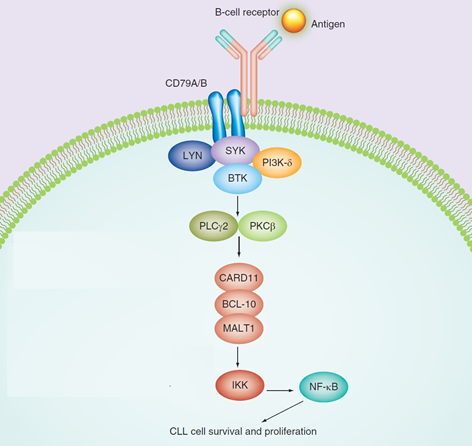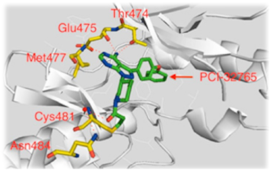 BTK激酶是一种蛋白质,在B细胞中表达,对B细胞受体信号通路起着非常关键的作用,对恶性B细胞的增殖、分化和凋亡有重要影响。2007,报道了第一个BTK抑制剂Ibrutinib(PCI-32765),与BTK活性位点中的半胱氨酸残基形成共价键,从而抑制BTK酶的活性。