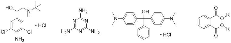 吊白块(NaHSO2·CH2O·2H2O)、瘦肉精、三聚氰胺、孔雀石绿、塑化剂、苏丹红、福尔马林等