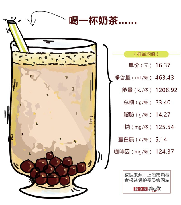 成人每日推荐摄入8400kJ能量,51杯抽检奶茶中能量最高的一杯奶茶可提供全天所需能量的1/3,一杯奶茶相当于一顿饭。