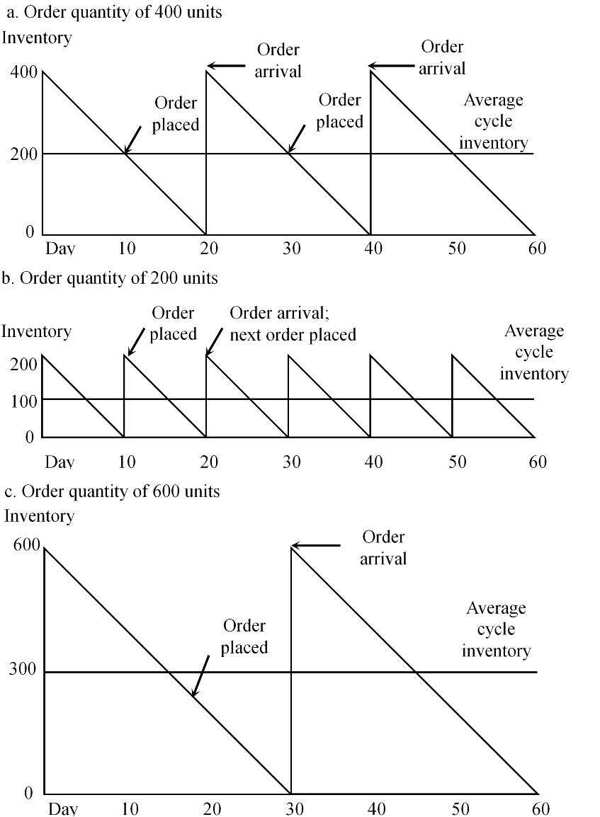 Assuming constant demand and lead time, salesof 20 units per day and 240 working days per year, annual sales will be 4,800units. If orders are placed every 10 days, 24 orders of 200 units will beplaced. With a 20-day order interval, 12 orders of 400 units are required. Ifthe 30-day order interval is selected, 8 orders of 600 units are necessary. Theaverage inventory is 100, 200, and 300 units, respectively. Which of thesepolicies would be best?