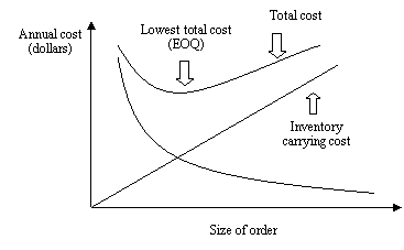 The best ordering policy can be determined byminimizing the total of inventory carrying costs and ordering costs using theeconomic order quantity (EOQ) model.