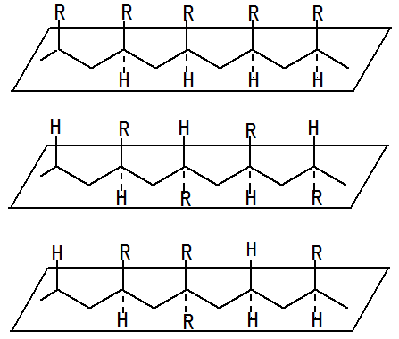 由于C=C双键是SP2杂化,使其处于平面结构,当双键带有取代基时,取代基在平面上下两侧的排列方式不同时,会出现全同立构、间同立构和无规立构三种排列方式。