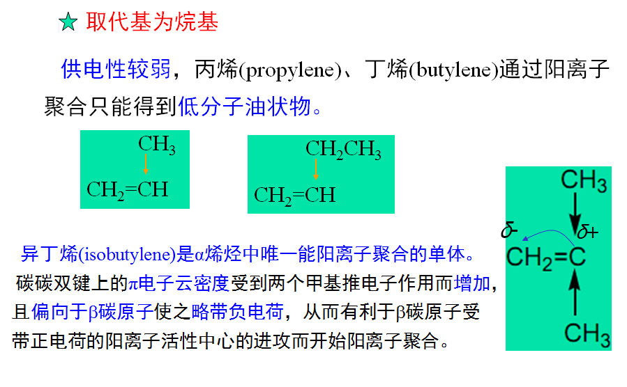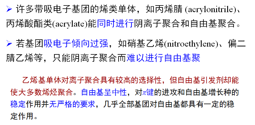 本章主要讲授连锁聚合反应,连锁聚合反应中,反应始终是围绕着特殊的“活性中心”进行,这与逐步聚合反应中官能团间的反应完全不同。而能打开π键的活性中心有三种主要类型,分别是自由基、阴离子与阳离子。