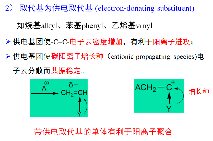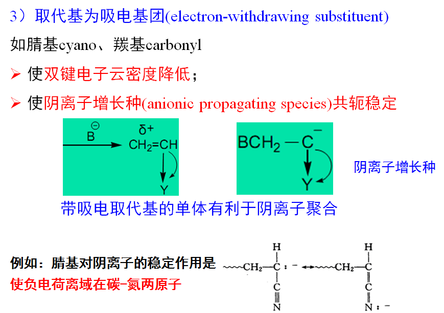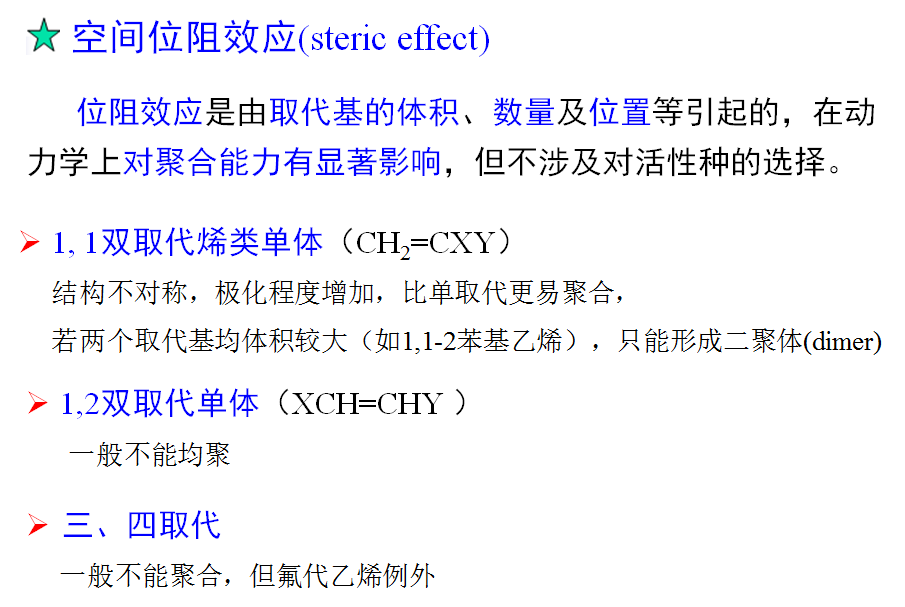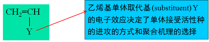 单体的电子效应(诱导效应与共和效应)决定了聚合机理的选择性。诱导效应(induction effect),取代基的供、吸电子性;共轭效应(resonance effect),由于轨道相互交盖而引起共轭体系中各键上的电子云密度发生平均化的一种电子效应。乙烯基单体取代基的诱导效应和共轭效应能改变双键的电子云密度,对所形成的活性种的稳定性有影响,从而决定着对自由基、阳离子或阴离子聚合的选择性。