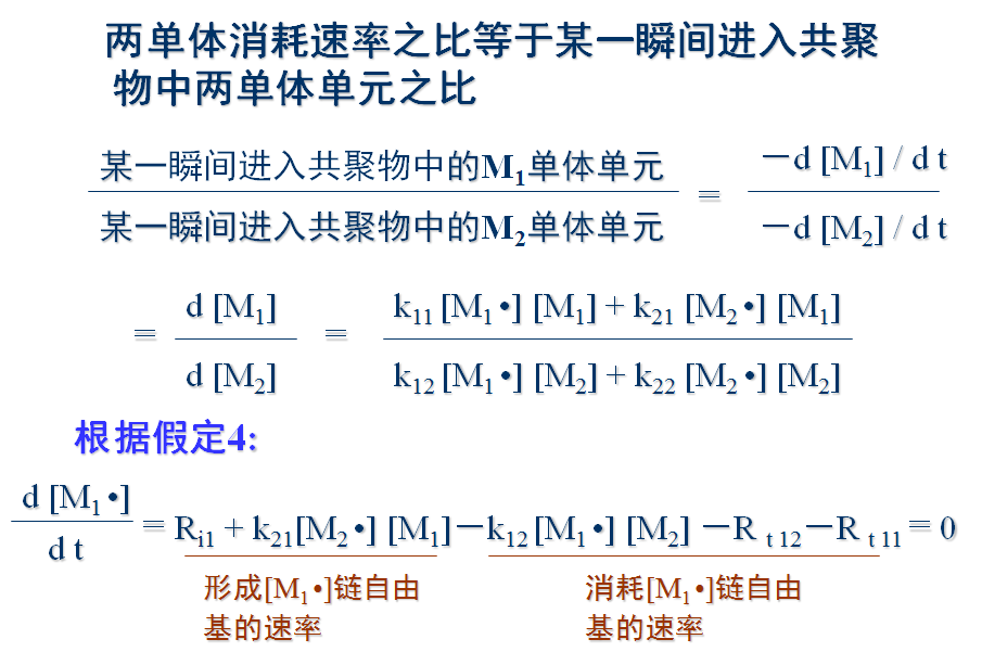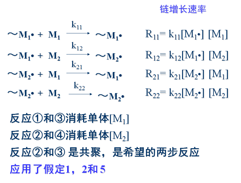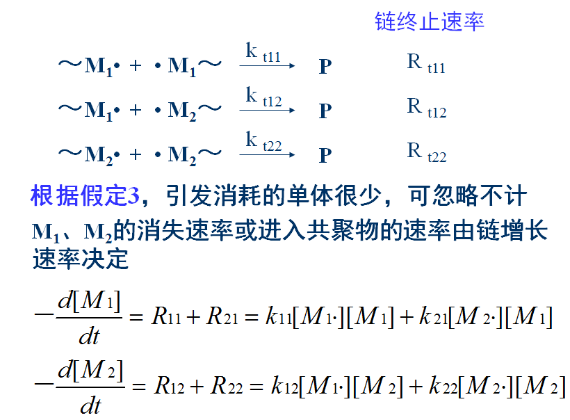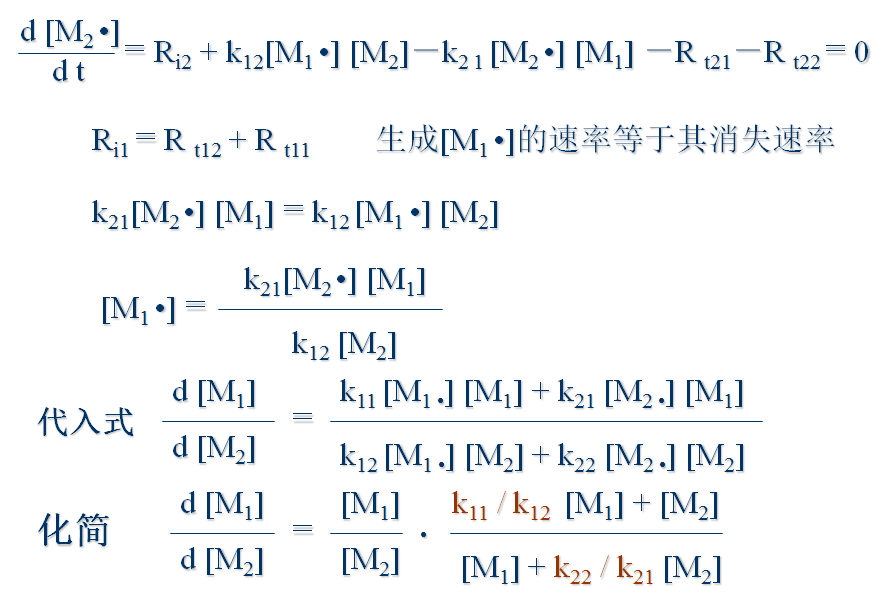 4)稳态。引发和终止速率相等,自由基总浓度不变:两种链自由基(M1•和M2•)相互转变速率相等,两种自由基浓度不变