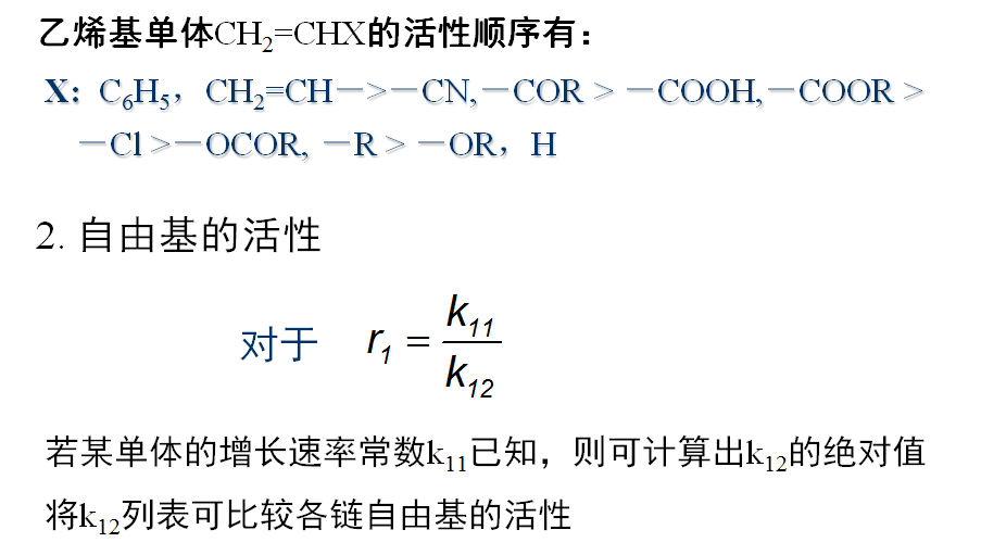 代表某链自由基同另一单体与本身单体反应的增长速率常数之比。两种单体对同一种链自由基的反应速率常数之比,链自由基相同,单体不同,可衡量两单体相对活性。取不同第二单体,可以列出一系列单体的相对活性。