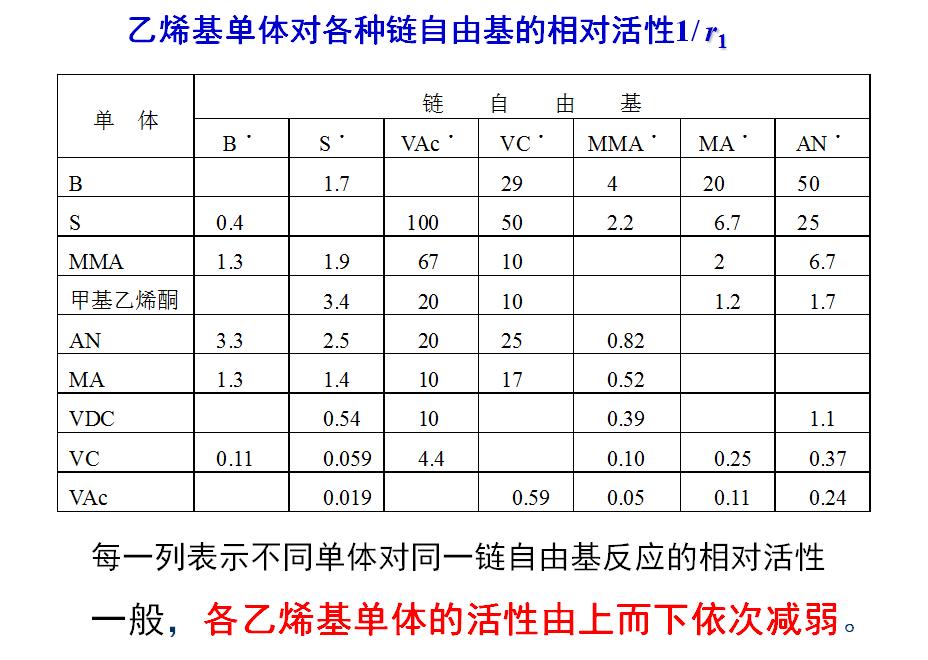 共聚物组成取决于竞聚率,而竞聚率又取决于单体及相应自由基的活性。