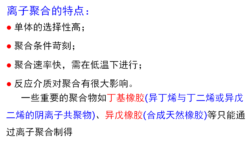 阴离子聚合无终止的主要原因:●活性链上脱负氢离子困难;●反离子一般为金属阳离子,无法从其中夺取某个原子或H+而终 止。● 如要发生向单体的转移,则要从活性链上脱去负氢原子H-,能量很高。向反离子转移也要脱去负氢原子,因此不易发生。