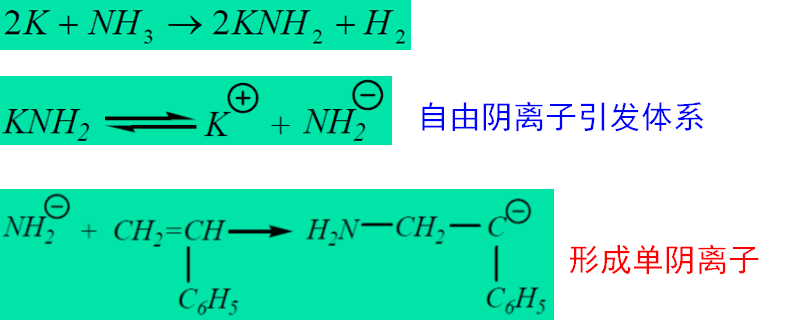 有机金属化合物:最常用的阴离子聚合引发剂如金属氨基化合物、金属烷基化合物等。以金属氨基化合物的引发为例:
