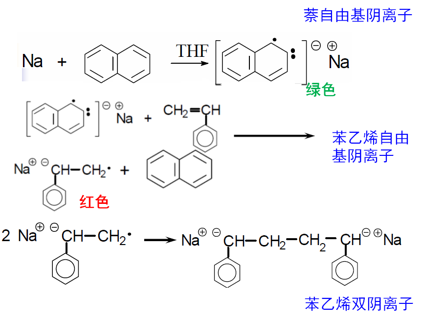 典例:钠和萘在四氢呋喃(THF)中引发苯乙烯聚合。四氢呋喃的作用是将氧上的未共用电子对与钠离子形成较稳定的络合阳离子,使萘钠结合疏松,更有利于萘自由基阴离子的引发。