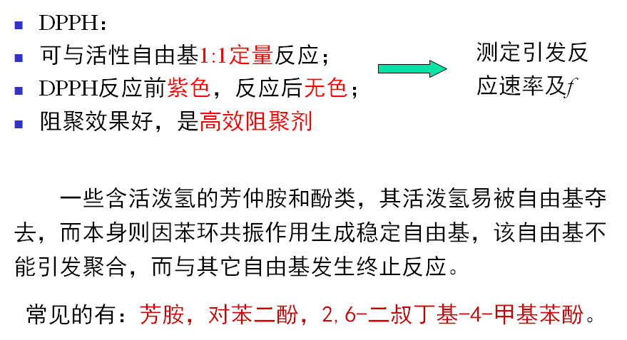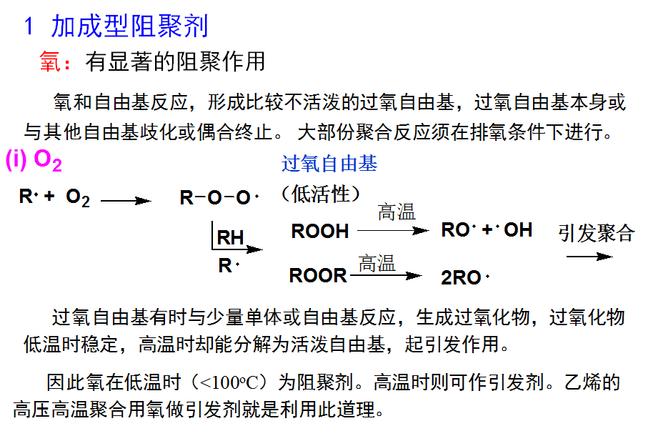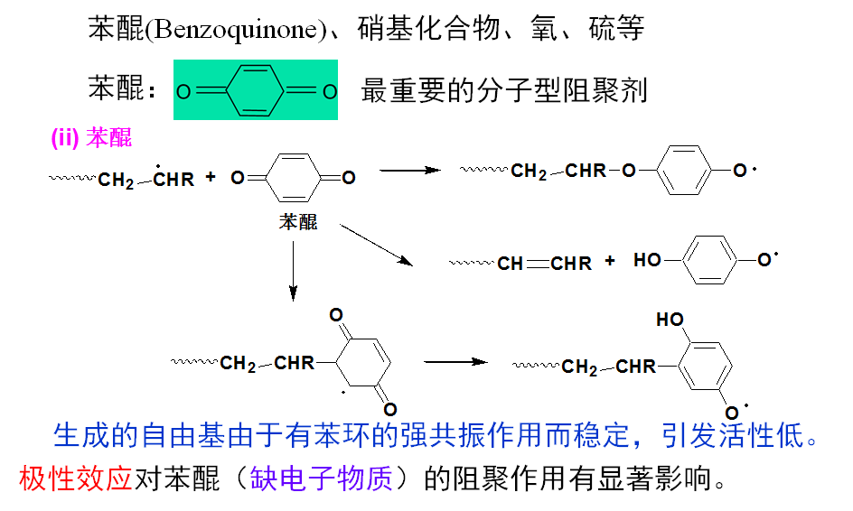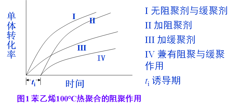 许多杂质对聚合有抑制作用,因此聚合的单体有纯度的要求。在贮运过程中,为了防止聚合发生,则又要加入一定量的防止聚合的物质,这类物质在聚合前再进行脱除。在有些聚合过程中,也要加入一些终止反应的物质(终止剂)防爆聚及控制转化率。这些问题都涉及了到阻聚和阻聚剂(inhibitor)的问题。