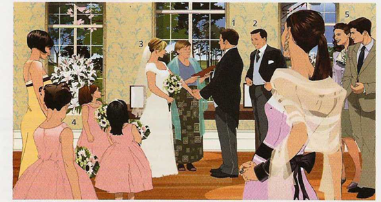 brings the rings to the wedding ceremony. The bride3 may have one or more bridesmaids4. Afterwards, there is a reception for the couple and the