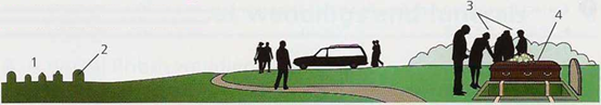 1 graves 2 gravestone 3 mourners;