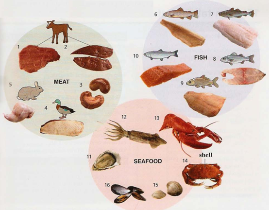 cover the words. Can you name the different types of meat, fish, and seafood?