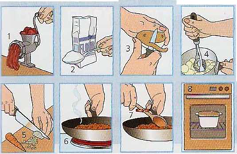 and vegetables quickly, then stir7 in the flour and cook for one minute. Add the stock, tomatoes, salt and pepper, and let it all cook slowly for 20
