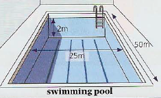 A standard Olympic swimming pool is 50 metres long, 25 metres wide, and has a minimum depth of two metres.