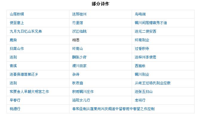 存诗400余首,代表诗作有《相思》、《山居秋暝》等。