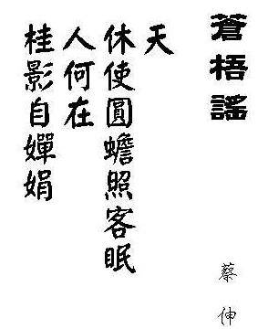 蔡伸,南北宋之交时人。这首词表现旅居外地,因为思念亲人而失眠的烦恼。作者不说自己心情烦乱,却把责任刁罪于月光的照射于是高喊:天啊!不要让圆月照着我这客居的人睡眠吧。“圆蟾”,传说月中有蟾蜍,这里代指圆月。他呼天无效,于是感叹:“我现在是在哪儿呀?月影空自美好,岂不增加我孤独的痛苦吗?”“桂影”,传说月中有一株五百丈的桂树,这里代指月影。全词仅十六字,含意尽在言外。感情强烈,手法别致。
