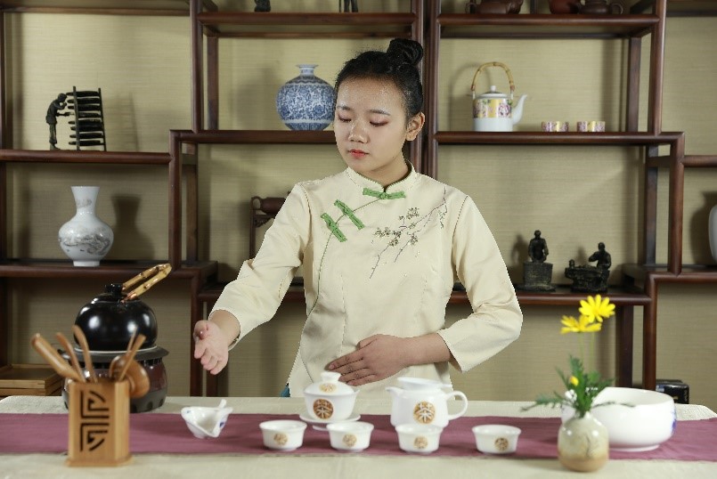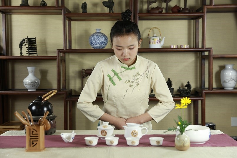在茶事服务中,通过点头致意,表达友好和礼貌。