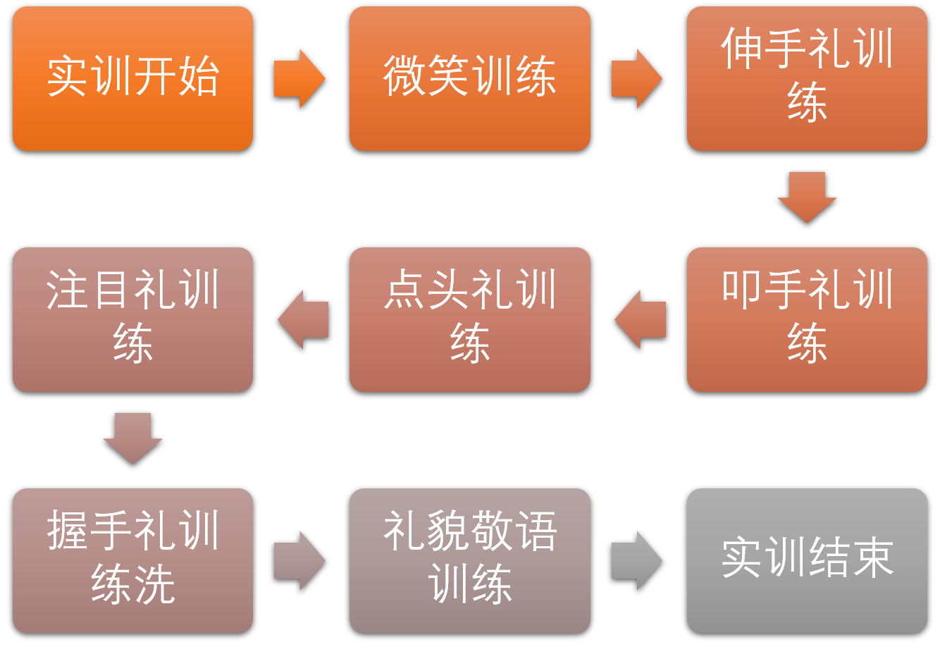 通过微笑、伸手礼、点头礼、叫手礼、握手礼等动作的训练和实际操作,提高员工时微笑等形体动作的认识和理解,使员工掌握标准服务姿态训练的基本方法和步骤