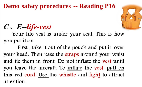 救生衣在您座椅下面的口袋里(座椅上方),仅供水上迫降时使用。在正常情况下请不要取出,除非乘务员要求您这么做。使用时取出,经头部穿好。将带子由后向前扣好系紧。