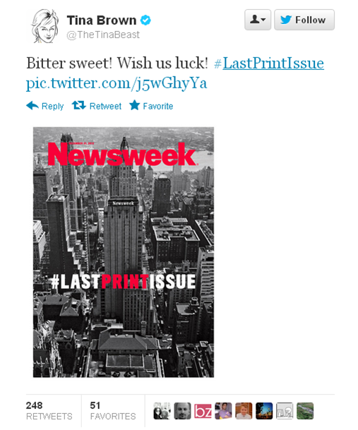 This is not a conventional magazine, or a hidebound place. It is in that spirit that we’re making our latest, momentous change, embracing a digital medium that all our competitors will one day need to embrace with the same fervor. We are ahead of the curve. A magazine that will soon turn 80 will now be, when all the changes are unveiled in February, a vigorous young publication all over again, taking its readers to territory that is new and uncharted. One thing, however, will not change, and that is our commitment to journalism of the very highest quality. We would not be Newsweek if it were otherwise. So as we say sayonara to print, we thank our 1.5 million loyal readers, and ask you to wish us luck and join us next year in our all-digital future.