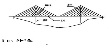 斜拉桥是由上部结构的斜拉索、塔柱和主梁及下部结构的桥墩、桥台4种基本构件组成的组合体系桥梁,如图10-5所示。高强度钢索起着混凝土主梁弹性支承的作用。这样,主梁就象跨度显著缩小的多跨弹性支承连续梁那样工作,从而使梁高大大减小,自重大大减轻,并能显著加大桥梁的跨越能力。而且,斜索的水平分力还成了混凝土梁的“免费”轴向预压力,一般来说,它对主梁起有利作用。