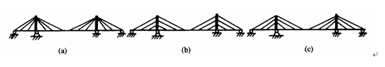1.悬浮体系——也称飘浮体系,它是将主梁除两端外全部用缆索吊起而在纵向可稍作浮动的一种具有弹性支承的单跨梁。在密索情况下,主梁各截面的变形和内力的变化都较平缓,全跨满载时塔柱处没有负弯矩的尖锋,负弯矩值不到其他三种体系的一半。空间动力计算表明,悬浮体系不能任其在横向随意“摆动”,而必须施加一定的横向约束,提高其振动频率以改善动力性能。