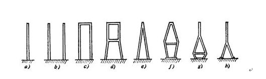 从行车方向看,塔柱又可作成独柱式、双柱式、门式、斜腿门式、倒V式、宝石式和倒Y式等多种形式,如下图所示。