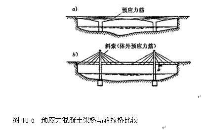 如果把斜拉桥比喻为预应力筋伸出梁外尽量增大偏心距的“高效能”预应力混凝土梁桥,这也是很耐人寻味的。在支点处显著增大的偏心距,充分发挥了预应力筋(斜索)抵抗负弯矩的能力,借以可有效地节约钢材,增大跨越能力。如图10-6所示: