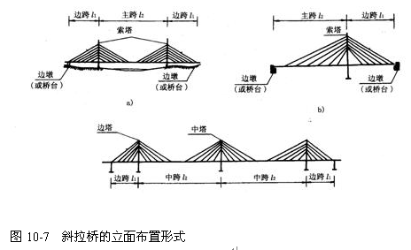 斜拉索是斜拉桥的主要承重构件之一。斜索的立面常选用以下3中基本形式:辐射式、竖琴式及扇式,如图10-8所示。