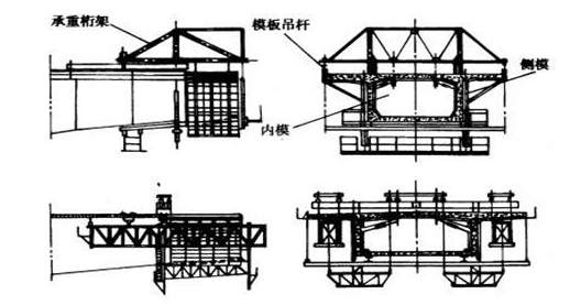 适用于变截面梁、变跨度桥、弯桥;支架要比挂篮的强度高,稳定性好,施工速度快;移动桁式吊需要有长度大于最大桥跨的桁架,施工设备比挂篮多些。