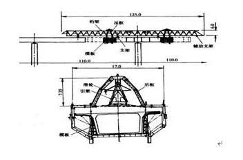 利用由钢结构组拼的桁架(导梁)悬吊移动式模板和施工设备进行悬臂浇筑施工;悬臂施工的节段重量和施工设备均由桁梁承担,通过桁架的支架和中间支架将荷重传到已浇筑完成的梁段和桥墩上;由于桁梁将已完成的梁段和正在悬臂浇筑施工的梁段连通,材料和设备均可由桥面运至施工桥孔。