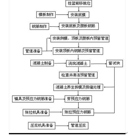 对于箱型截面,如果所浇混凝土数量不大,可采用全截面一次浇筑,其施工工艺流程(如下图所示)。如果混凝土数量较大,每一梁段的混凝土通常分两次浇