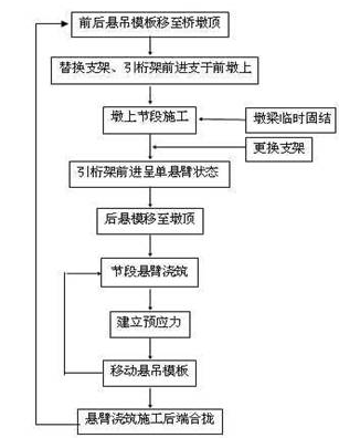 前后悬吊模板移向墩顶→移动桁梁移至前方墩→浇筑前方墩节段→张拉预应力→梁墩临时固结→引桁架前进呈单悬臂梁→对称悬浇施工→逐加预应力→与后方悬浇梁端合拢。
