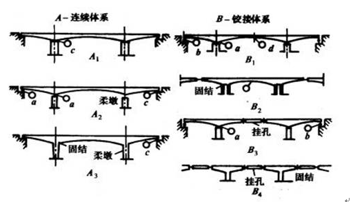 图中:A1---刚墩铰支连续梁;A2---柔墩铰支连续梁;A3---柔墩固结连续刚架;B1---铰接悬臂梁;B2---连续框式悬臂梁;B3---挂孔悬臂梁;B2---带挂孔的T形刚构;a---混凝土铰;b---钢筋混凝土摆座;c---橡胶支座;d---剪力铰;