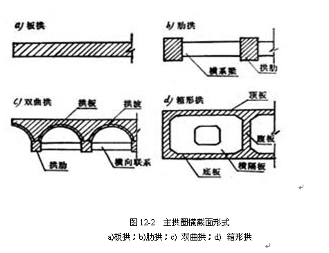 箱形拱截面抵抗矩较大,可节省材料,对于大跨径桥则效果更为显著。特别适用于无支架施工。但箱形截面制作复杂,一般只在跨径在50m以上的拱桥采用箱形截面。如图12-2 d)所示。