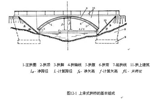 拱桥由上部结构和下部结构两大部分组成。上部结构是由拱圈及其上面的拱上建筑所构成。拱圈是主要承重结构。桥面系包括行车道、人行道及两侧的栏杆或砌筑的矮墙等构造。下部结构由桥墩、桥台及基础等组成。其主要组成部分见下图12--1所示。